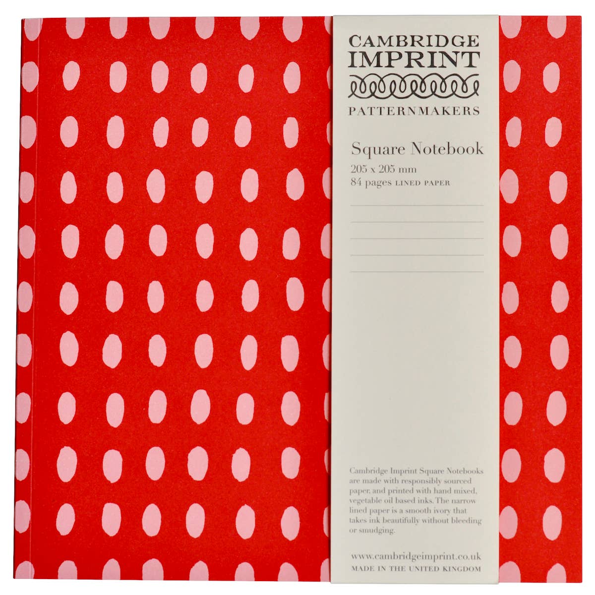 Cambridge Imprint square exercise books containing 84 pages of smooth cream paper with an elegant narrow-spaced line. There is no label or branding on the cover of patterned card - just our name stamped discreetly on the inside back cover.