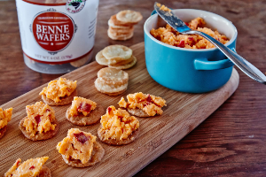 The Benne Wafer is a thin cookie, made with tasty toasted sesame seeds. There is a long standing culinary history in Charleston for this very unique sweet treat. Serve with Pimento Cheese as an appetizer or make bite-size ice cream sandwiches for desert.