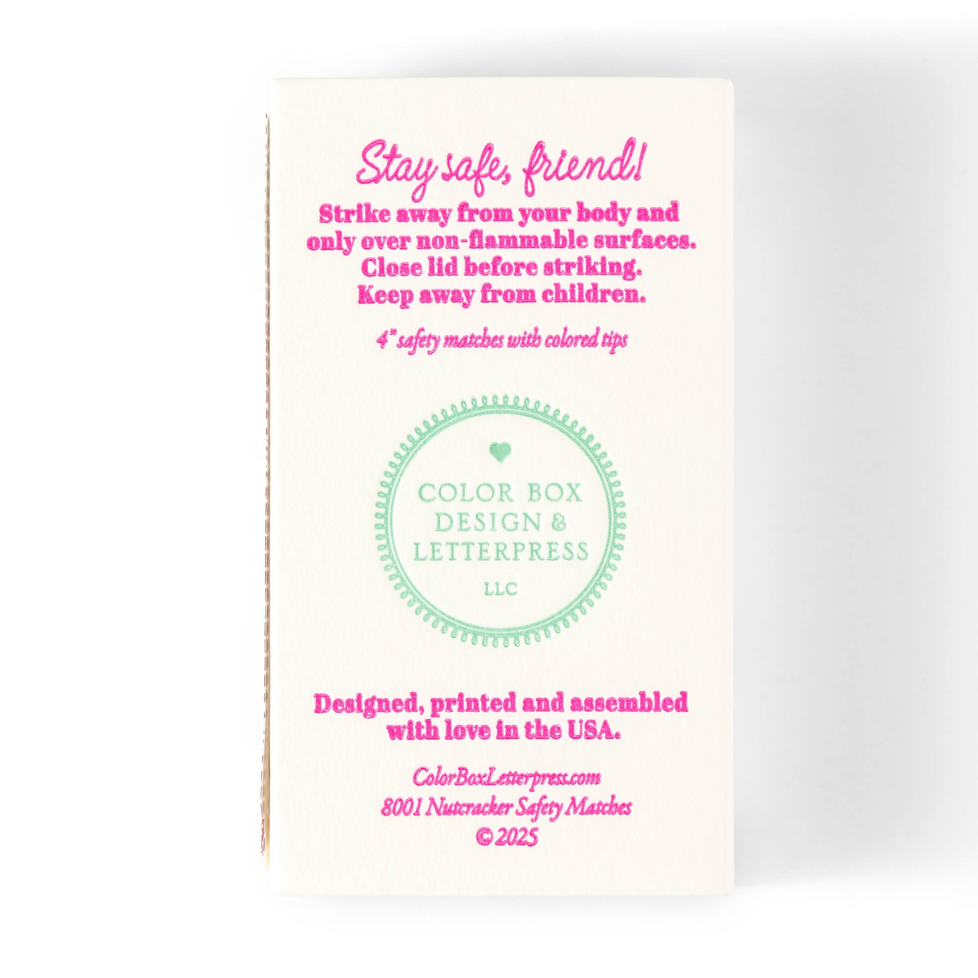With a festive nutcracker front and center—printed in punchy pink and mint green—this matchbox is pure holiday cheer with a vintage twist. The bold letterpress design gives it rich texture and charm, making it a standout on any mantel, table, or stocking.