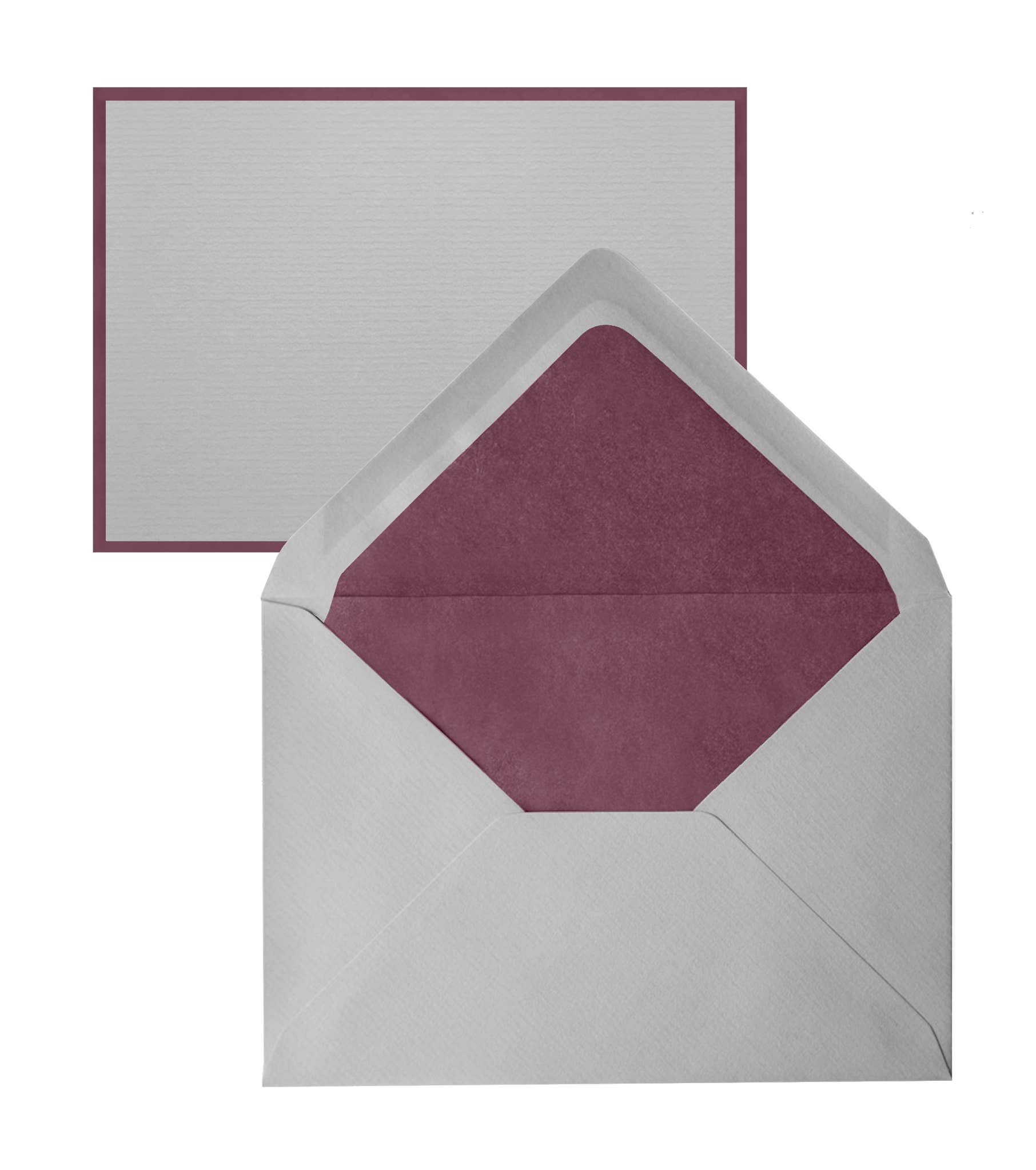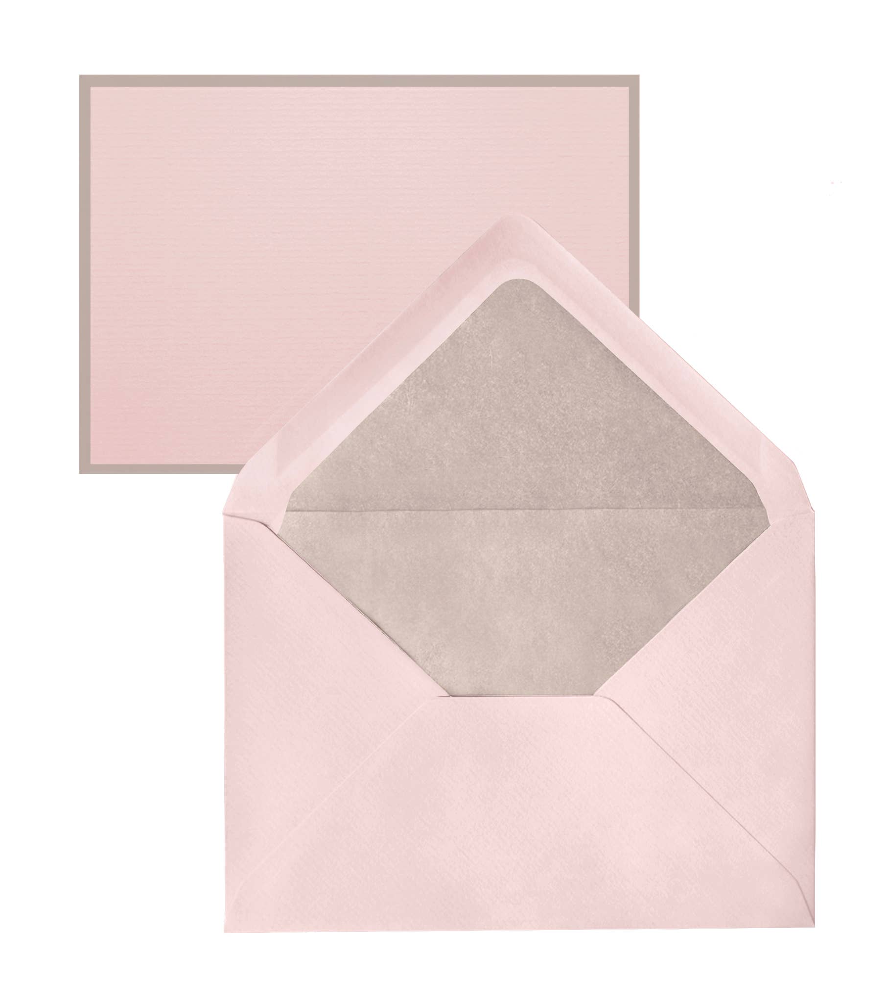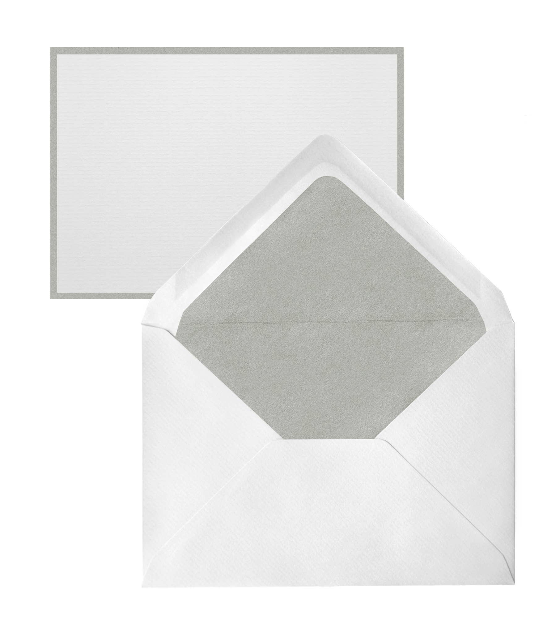The laid finish 280g 4" x 6" flat note cards are printed with a contrasting border and 100g envelopes with assorted tissue linings. There are 2 packaging options - Boxed in a handsome silver box with 25 note cards and 25 envelopes.