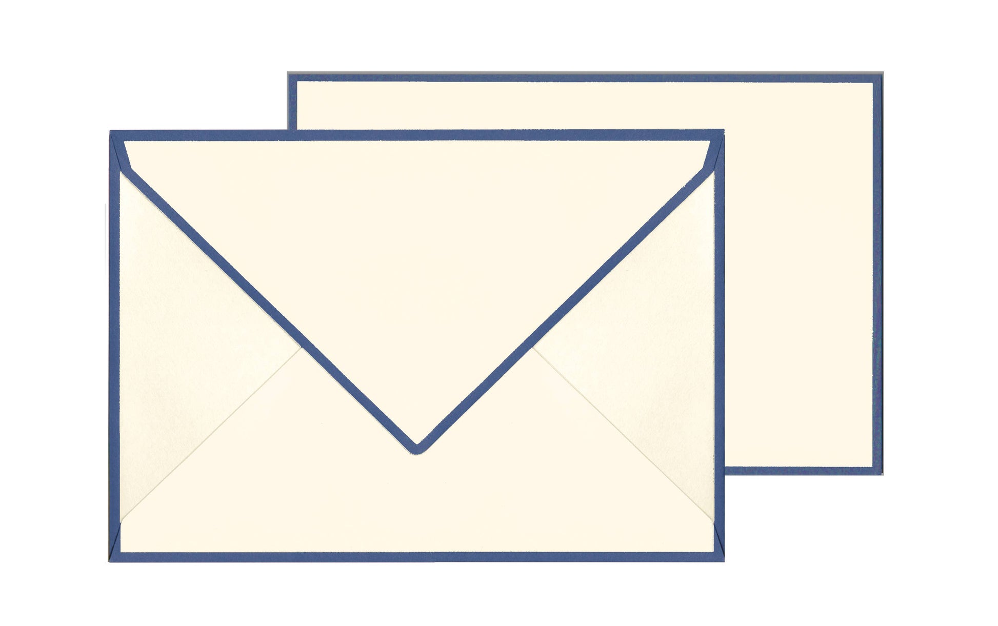 10, 4" x 6" flat, 300g smooth finish note cards and 10 envelopes with a contrasting border on each and every edge. In a transparent box. Made in Belgium.