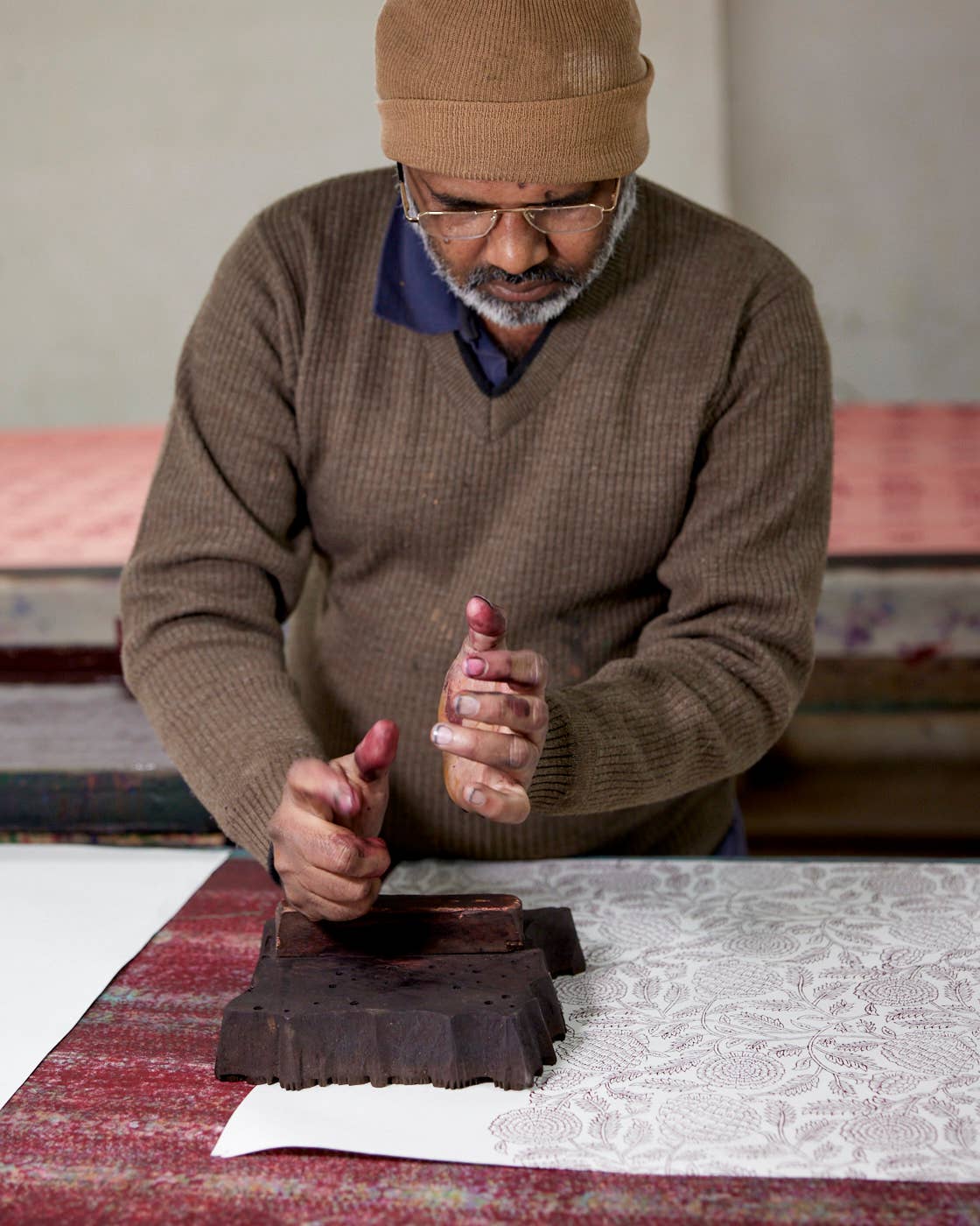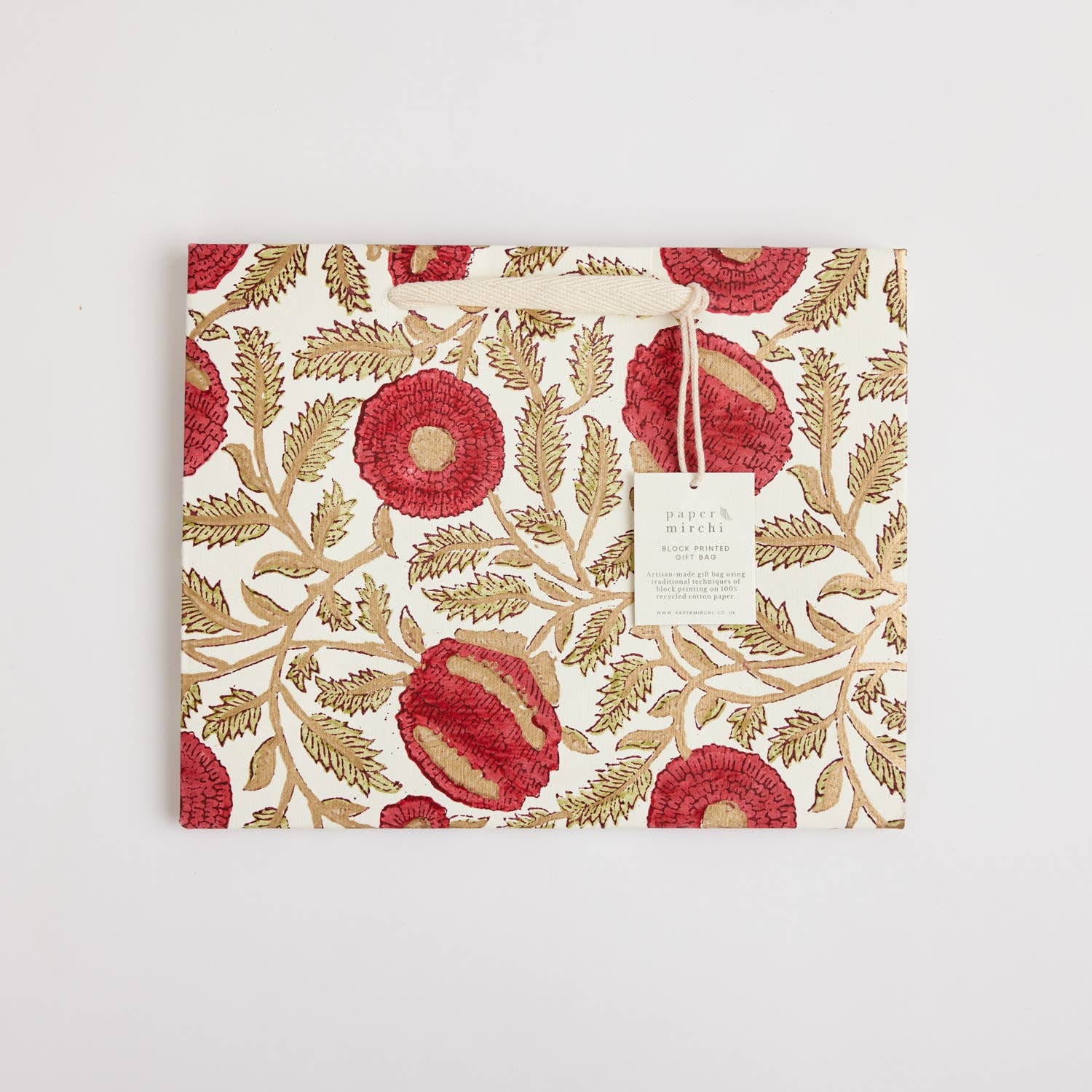 Our hand block printed gift bags are made from a strong 250gsm recycled cotton card paper in colours and designs complementing the gift wrap range. The bags are block printed using traditional techniques, and are not digitally mass produced. The cotton rope handles enhance the artisanal look of the bags and the matching swing tag carries a short blurb about the story behind the bags. Medium H20 X W25 X D10cm 100% recycled cotton paper.
